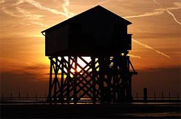 den Strand von St.Peter-Ording typischen Pfahlbauten.